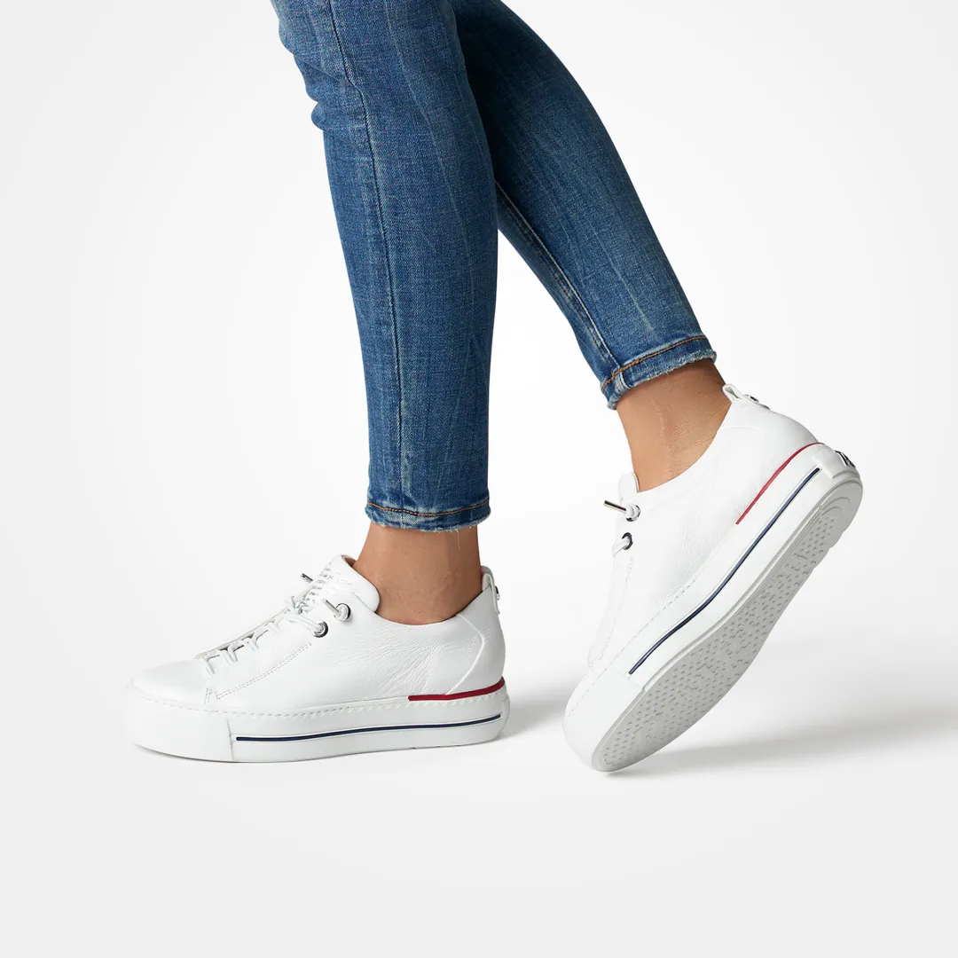 These SUPER SOFT Pauls from Paul Green are perfect for hip everyday styles. The model impresses with white smooth leather and colorful details. The elastic laces ensure a relaxed feel. Thanks to the super soft finish, the pair provides extra comfort. The wide outsole convinces with a trendy look. A perfect duo for leisure or the office! Paul Green makes shoes with great passion and mastery, which is expressed in perfection, quality, style and fit. The result: a unique, uplifting wearing experience! The Paul Green effect.