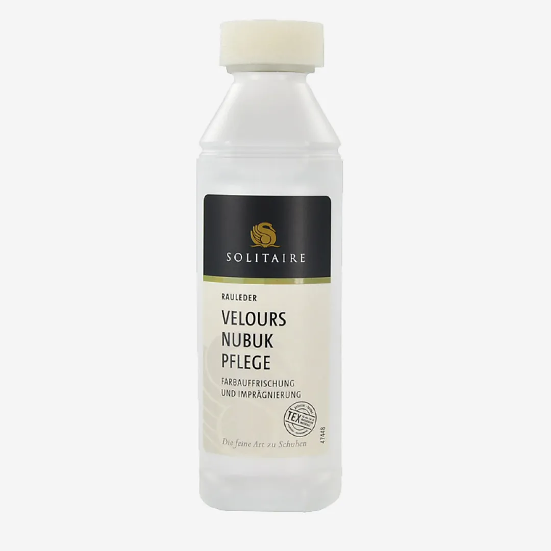 Brown colored suede/nubuck care from Solitaire. Impregnates and has a color activating effect. Ideal care for suede and nubuck leather as well as textiles and tex-materials. Contents: 75 ml. Directions for use: Shake bottle well before use. Dab the liquid onto the shoe. Then allow to dry and then roughen with a suede leather brush.