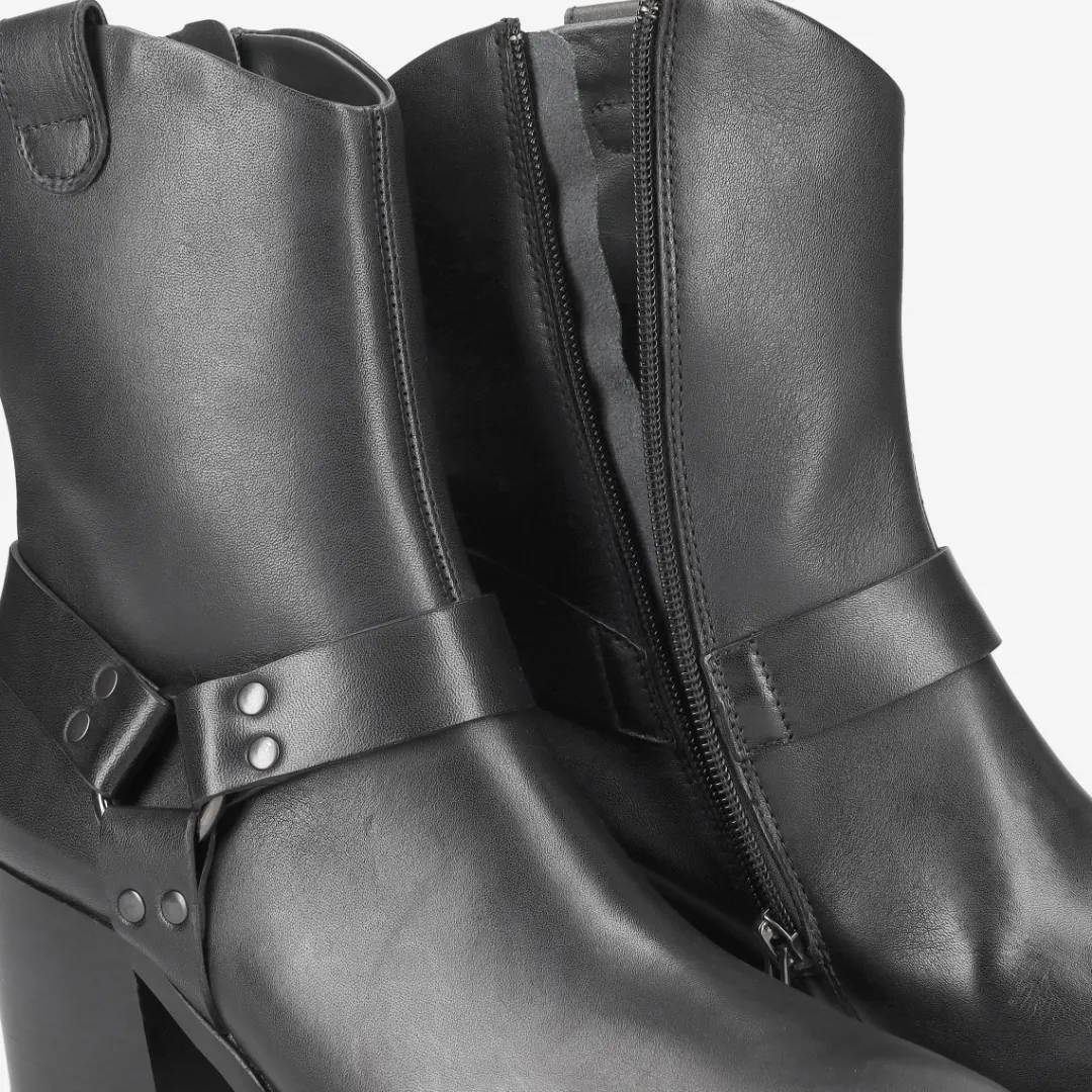 - Zipper, metal fastening with stylish decorative straps,, block heel, Made in Europe PFI Eco-Label LWG – Leather Working Group certified, metal application, entry loop, breathable, leather straps in biker look, Western-style design