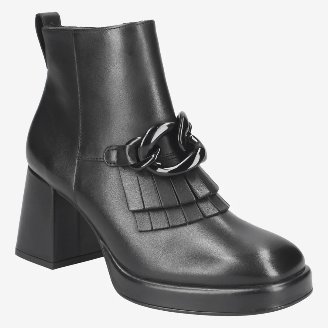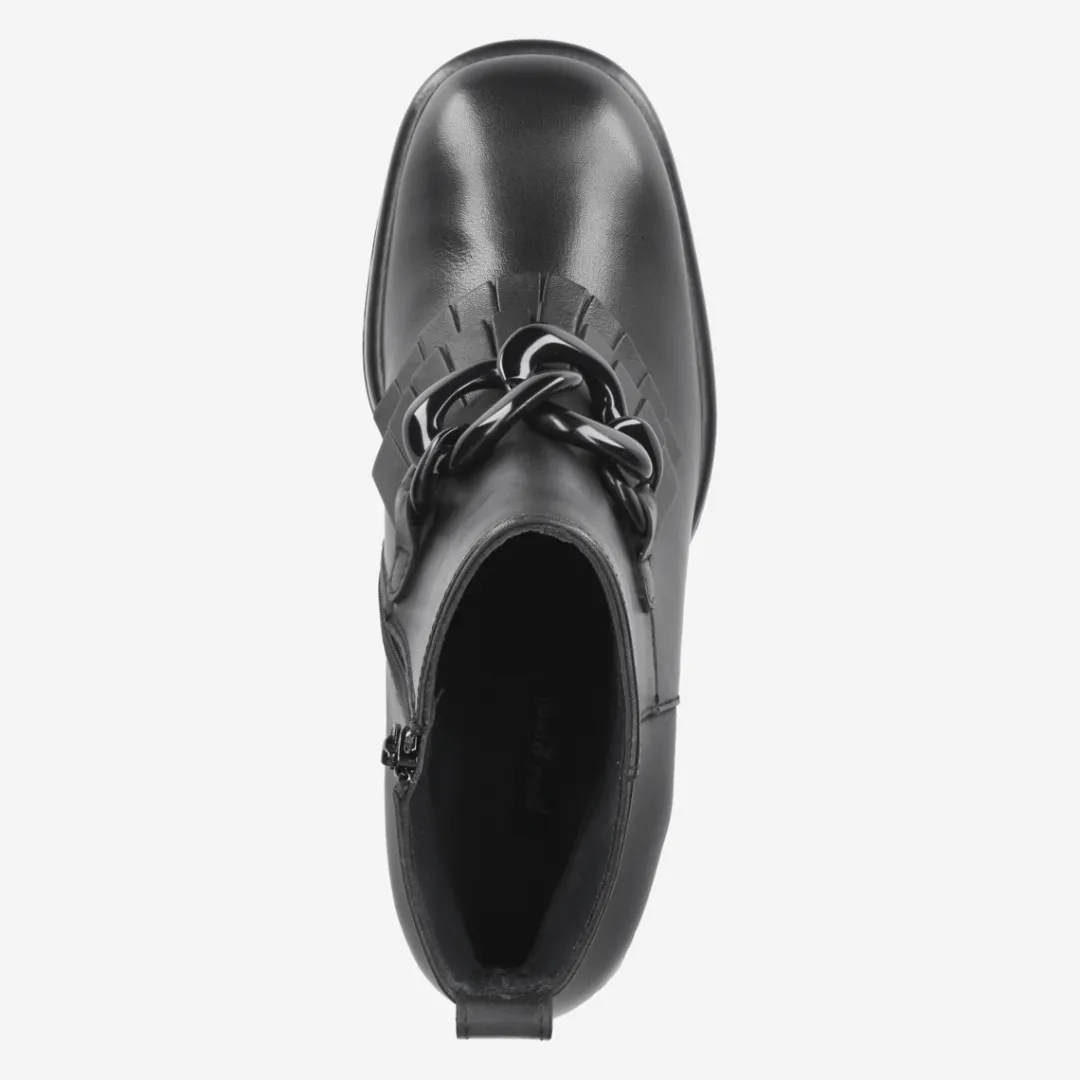 Stylish and noble present these ankle boots from Paul Green. The purist design of black smooth leather emphasizes a tonal jewelry chain and noble fringe detail around the instep area. A trendy block heel with a light platform sole makes for an absolute fashion statement. Paul Green shoes have a DNA of elegance and sportiness. This DNA is in every single shoe and in the entire range.