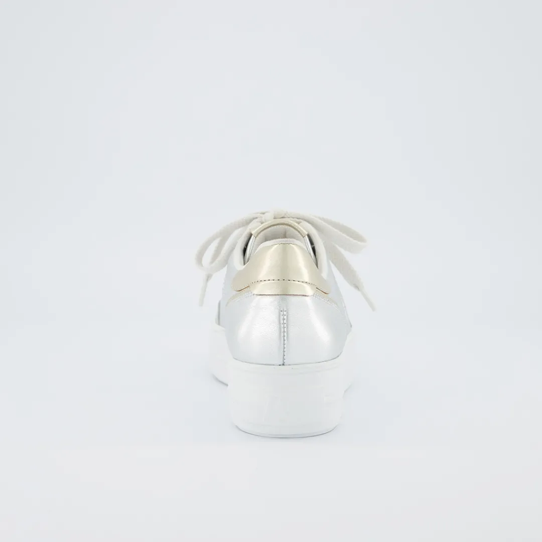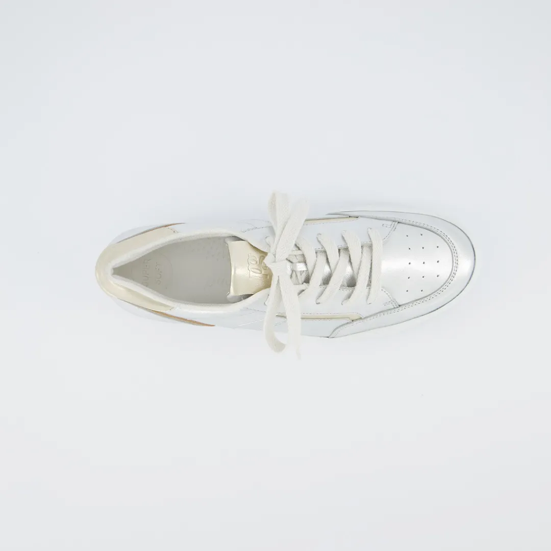 - Made in Europe PFI Eco-Label LWG – Leather Working Group certified, SuperSoft, supple leather, soft heel cap, light and flexible outsole, soft footbed, decorative stitching, logo embossing, decorative perforations, padded shaft, elegant metallic look with silver and gold, platform sole