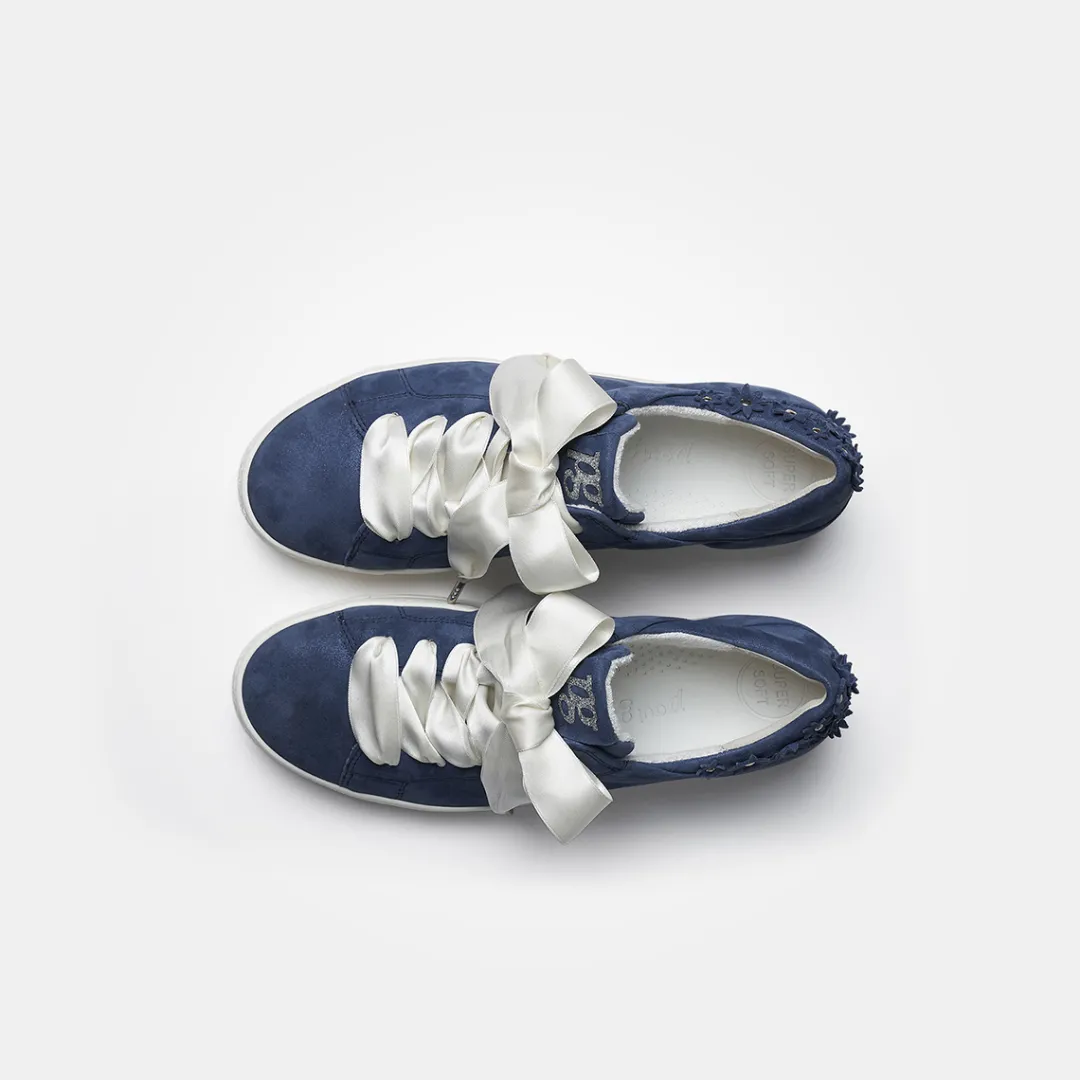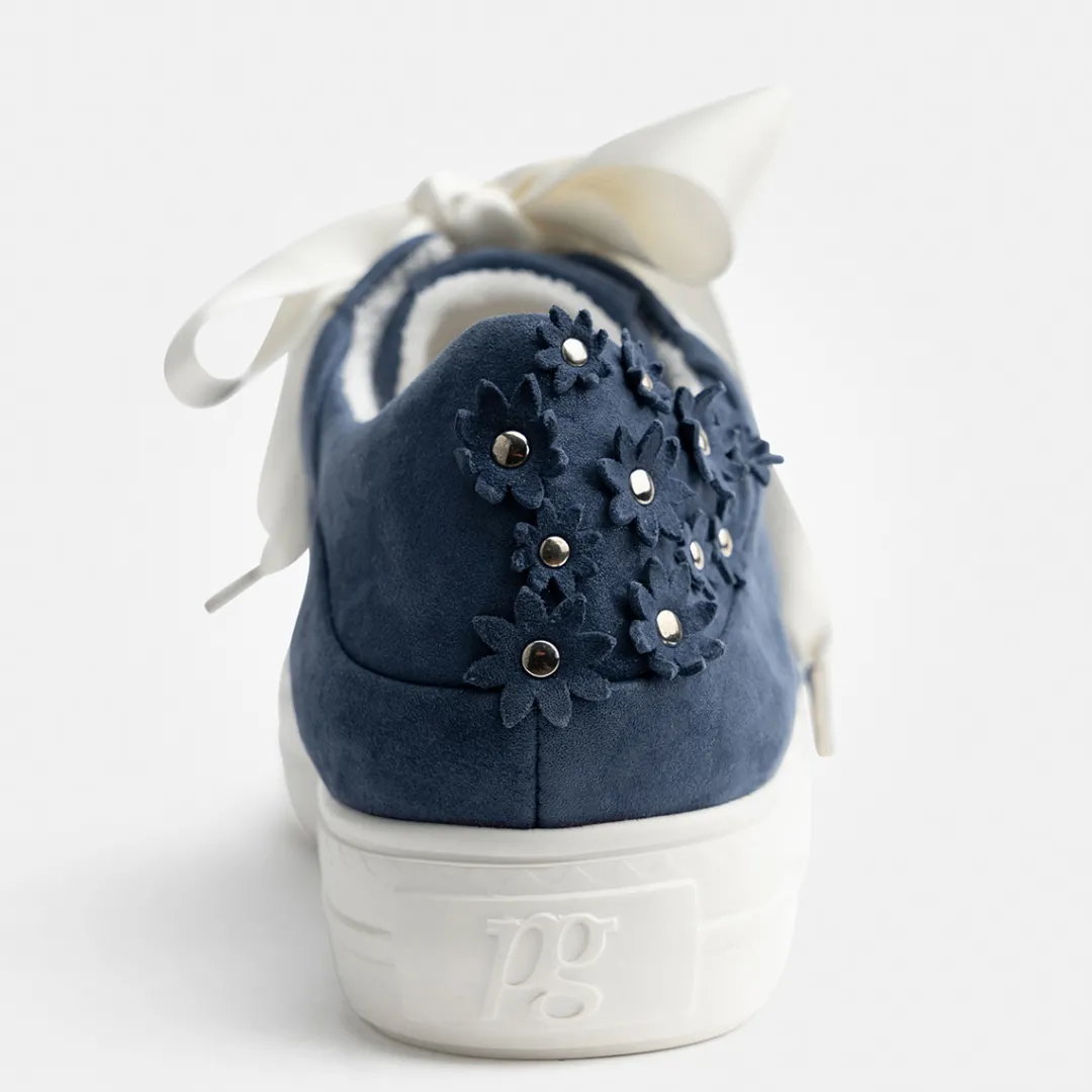 These SUPER SOFT Pauls from Paul Green have a pretty style and a romantic touch. These playful trainers made of blue velvet leather with detailed flowers on the heel will add a charming flair to your wardrobe. An absolute eye-catcher with the matching satin ribbon. A super soft leather lining with TENCELâ„¢ fibres optimizes the outstanding comfort. Discover this pair for trendy looks! Paul Green makes shoes with great passion, which is expressed in perfection, quality, style and fit. The result: a unique, uplifting feel!