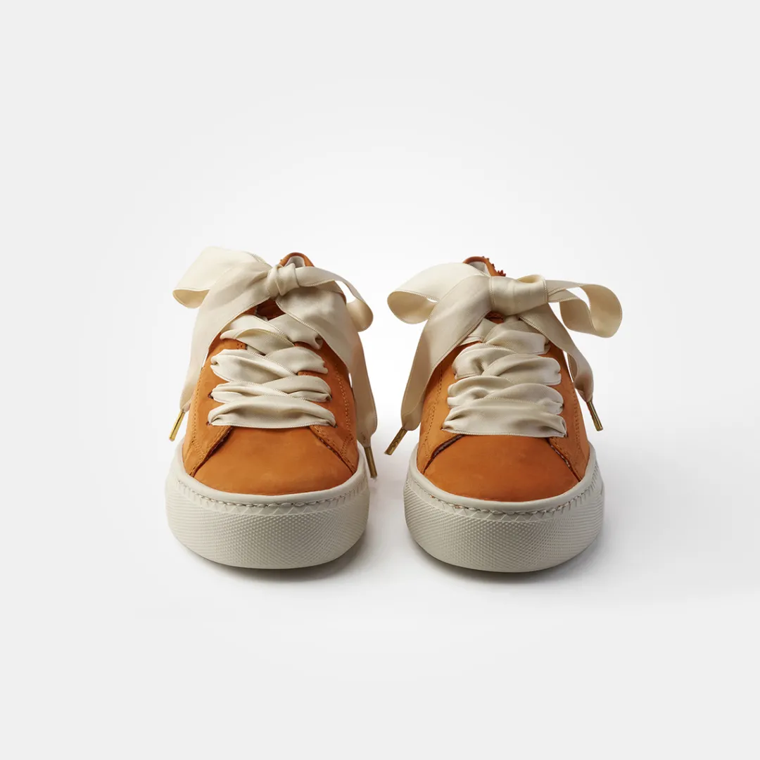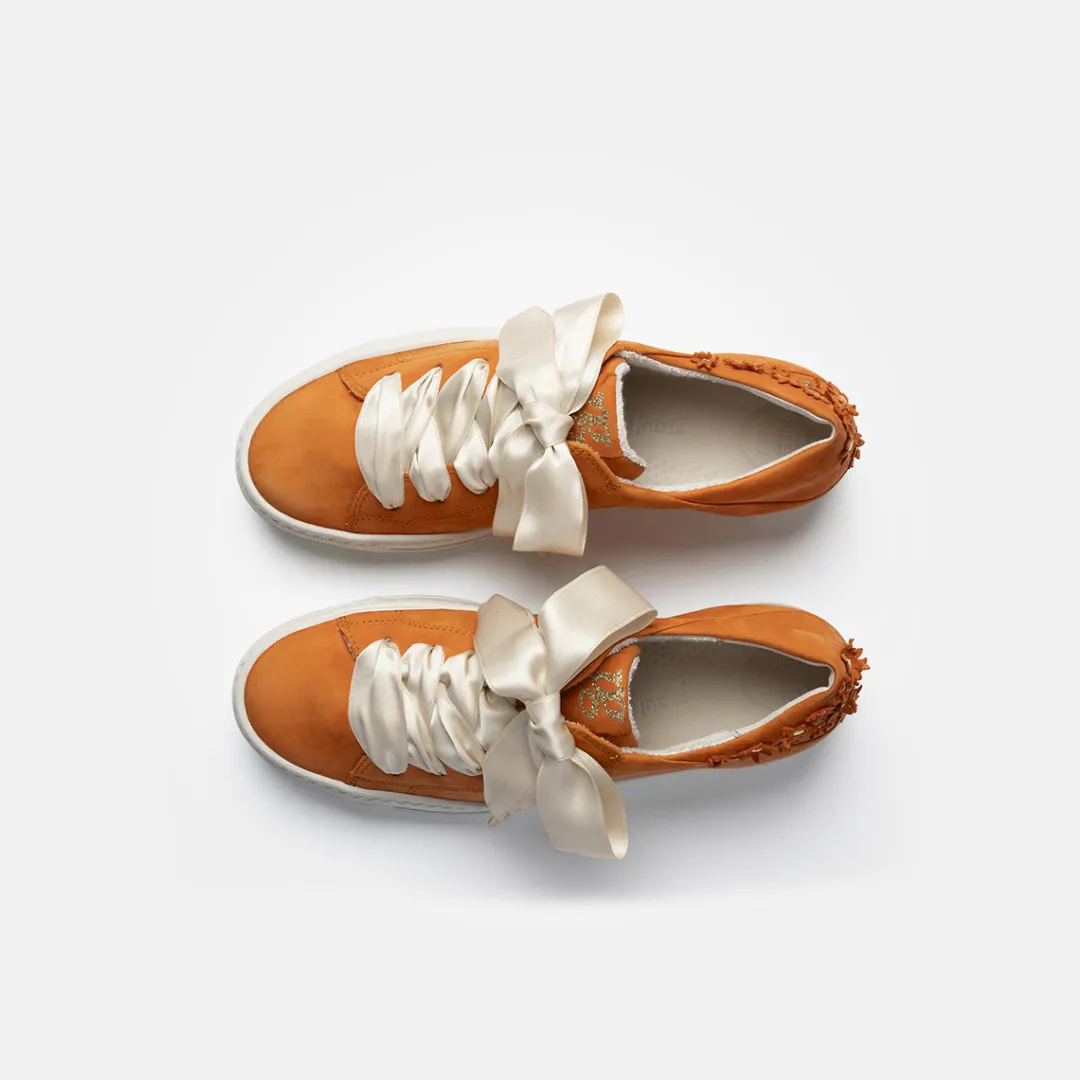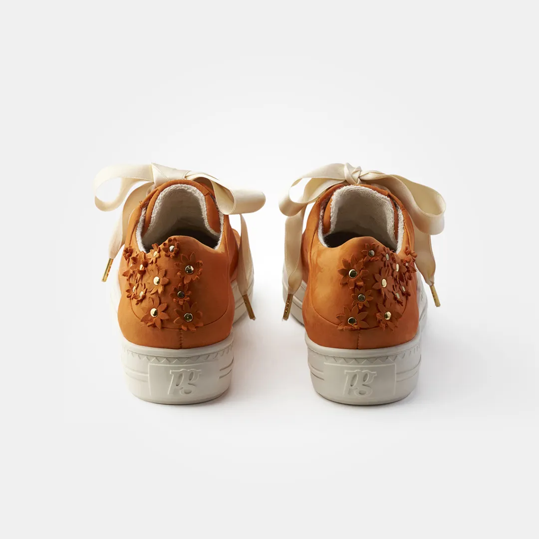 These SUPER SOFT Pauls from Paul Green have a pretty style and a romantic touch. These playful trainers made of orange nubuck leather with detailed flowers on the heel will add a charming flair to your wardrobe. An absolute eye-catcher with the matching satin ribbon. A super soft leather lining with terrycloth optimizes the outstanding comfort. Discover this pair for trendy looks! Paul Green makes shoes with great passion, which is expressed in perfection, quality, style and fit. The result: a unique, uplifting feel!