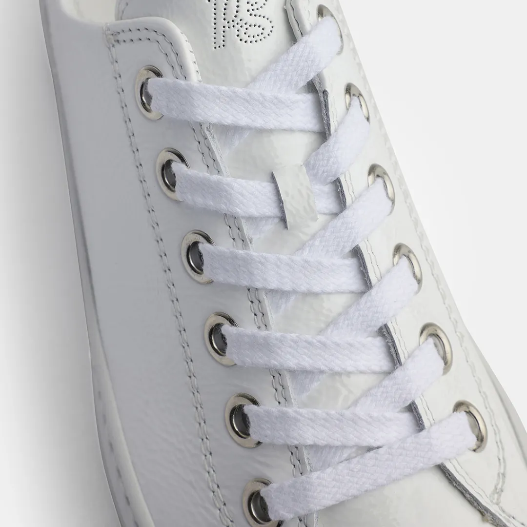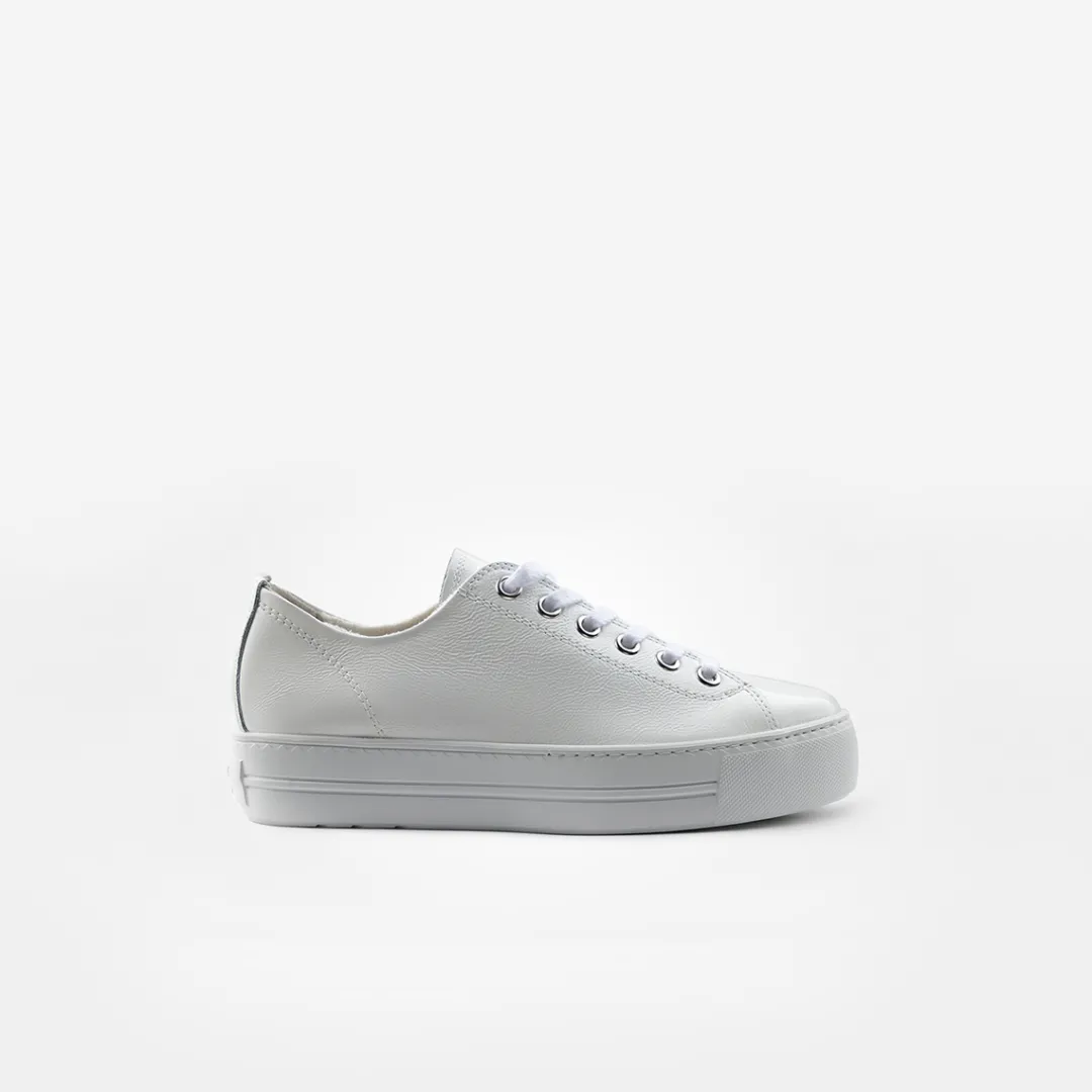 With the new platform models from Paul Green, you can really talk about a radiant appearance for once. The soft crumpled patent leather and the terry laces in combination with the PG Soft technology make the model an absolute comfort experience, both visually and haptically. The discreet decorative stitching further refines the image. Thanks to the pure white appearance, both the impressive sole and the striking leather immediately get a lot of attention and create a fantastic overall image