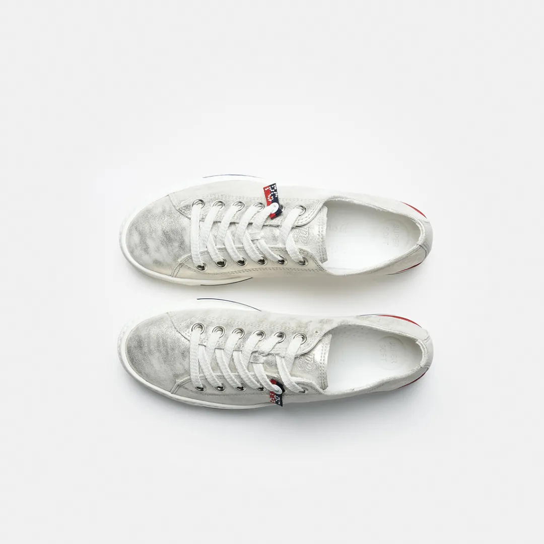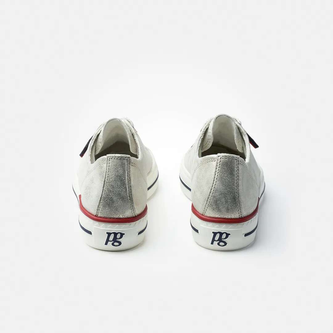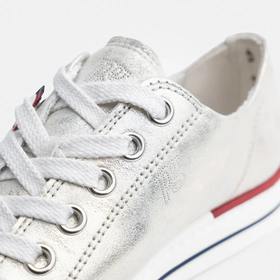 These first-class SUPER SOFT Pauls from Paul Green are an excellent addition to your shoe collection and the epitome of casual style. The model boasts a clean look made from extremely soft, silver metallic leather. The attractive outsole in a trendy striped design also adds a stylish accent. The red and blue grosgrain ribbon on the laces gives the model an eye-catching accent. A super soft heel section hugs the foot comfortably and the soft leather lining with TENCEL™ fibers ensures a pleasant feel. Walk comfortably throughout the day. Definitely the perfect sneaker for your fashionable street styles! Each Paul Green shoe is made by hand in up to 160 steps and then checked. This ensures that they meet the high standards of fit and quality.