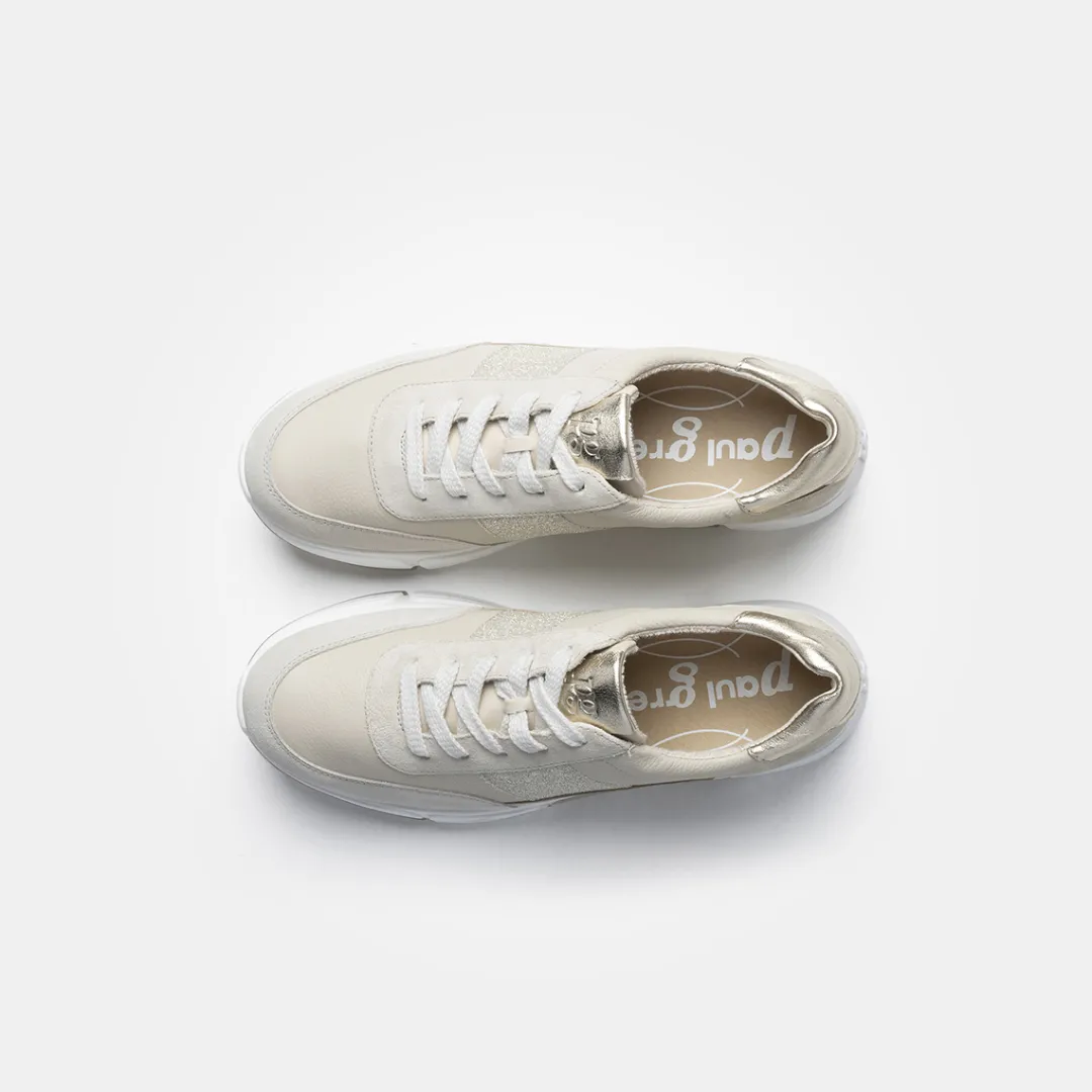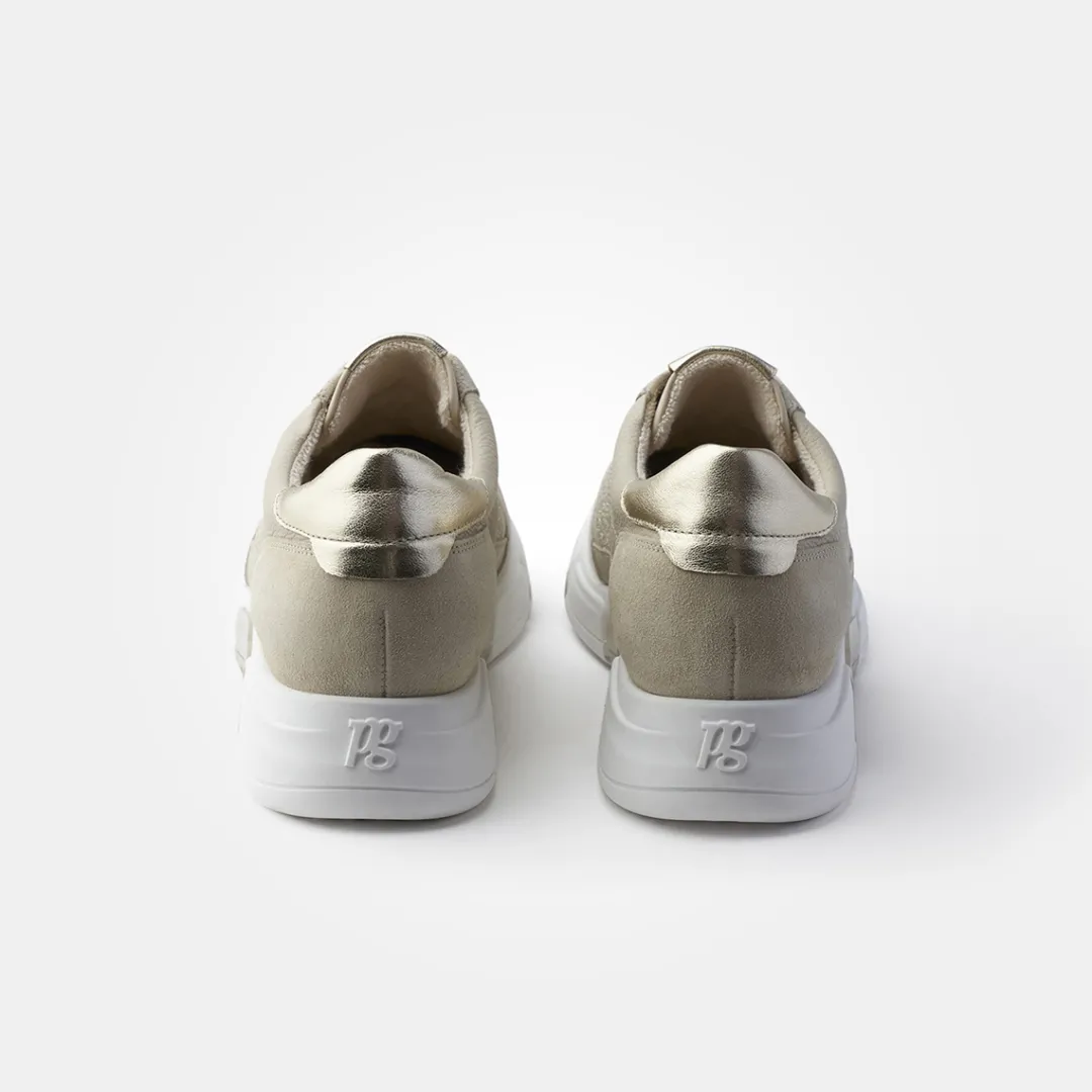 These SUPER SOFT trainers with removable footbed by Paul Green will give your everyday look a relaxed and casual style. This sporty pair in beige suede and grained leather with glitter details on the side can be stylishly combined with your favorite pieces from your casual wardrobe. The model has a removable footbed that can be replaced with an orthopaedic insole if required. An outsole with a slight platform rounds off this beautiful pair perfectly. Comfortable chic for every day! Paul Green shoes have a DNA of elegance and sportiness. This DNA can be found in every single shoe and in the entire range.