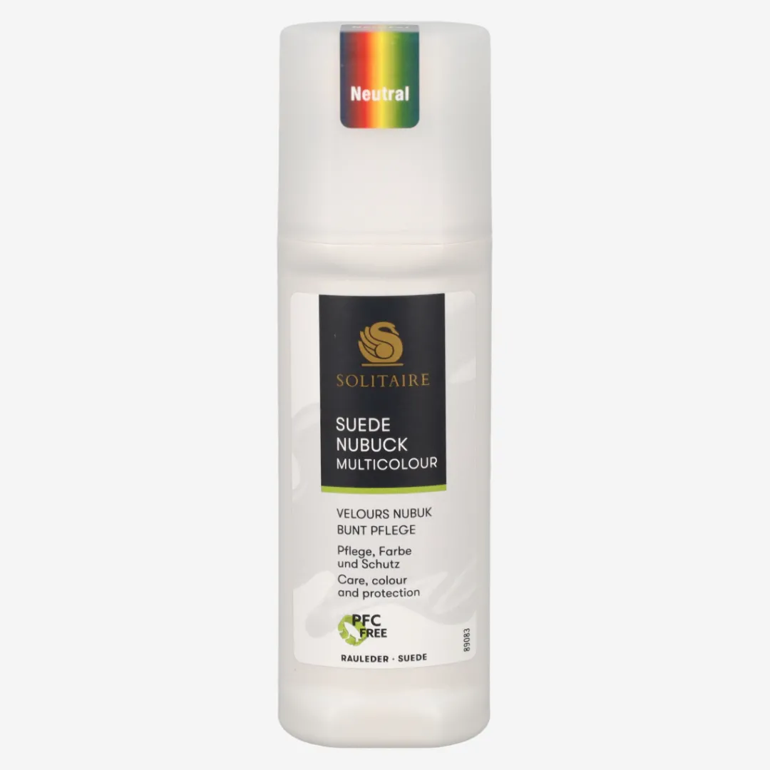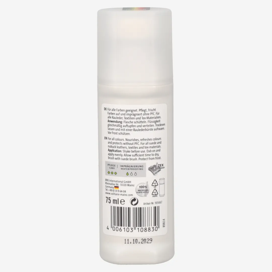 Velours/Nubuck color care from Solitaire. Impregnates and has a color activating effect. Ideal care for suede and nubuck leather as well as textiles and tex-materials. Contents: 75 ml. Directions for use: Shake bottle well before use. Dab the liquid onto the shoe. Then allow to dry and then roughen with a suede leather brush.
