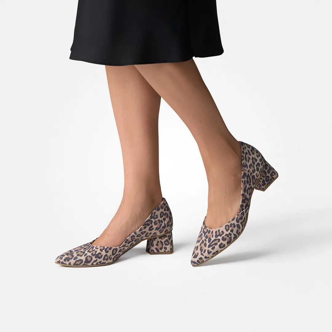 - Block heel, tapered model, in trendy leo-animal print, breathable