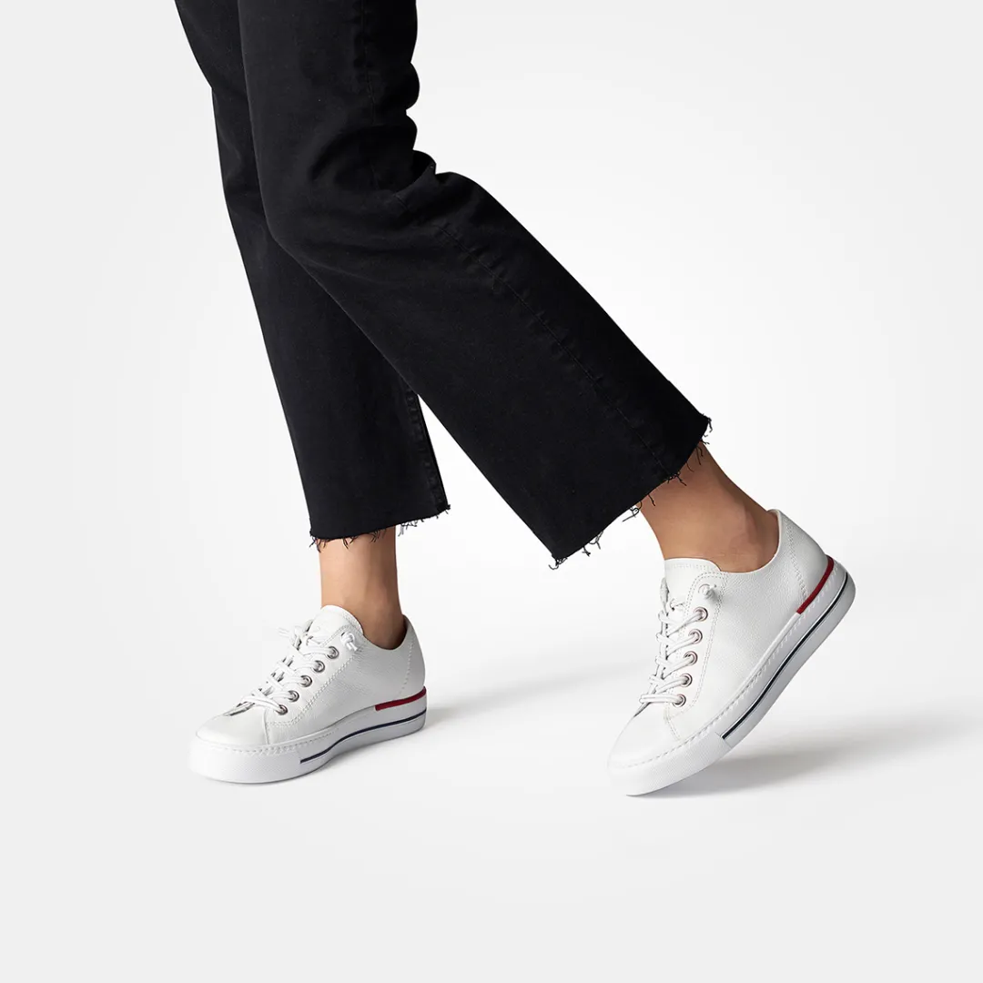 These SUPER SOFT Pauls with RELAX-WEITE complete any chic city wardrobe. The classic silhouette is made from soft smooth leather in white with silver details and ensures optimum support thanks to the elasticated laces. The leather lining with cosy TENCELâ„¢ fibers also ensures perfect comfort. This model also has additional features. The soft footbed is removable and can be replaced with your own insole if desired. The elastic outsole will also spoil you with the best comfort. Perfect with denim or casual skirts!