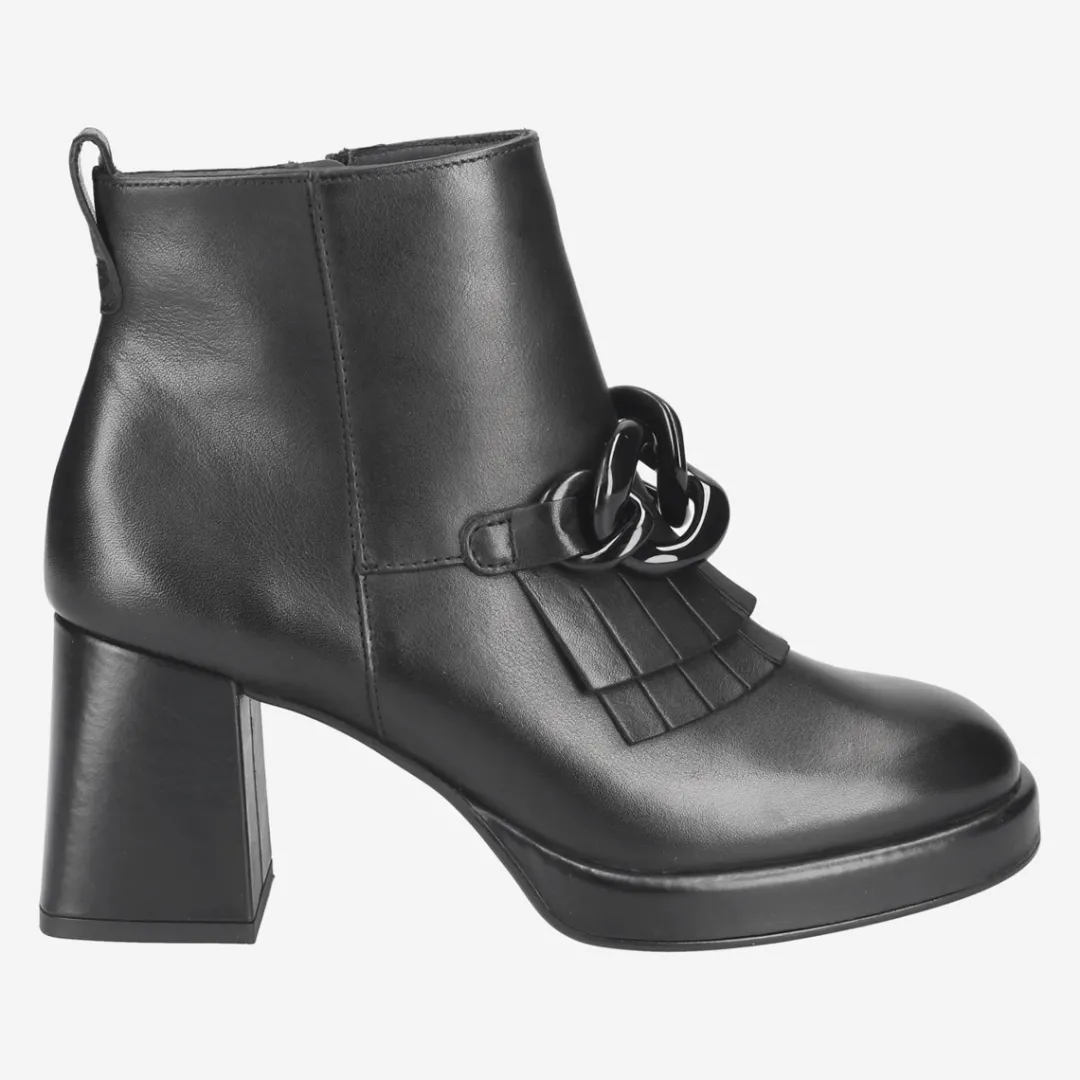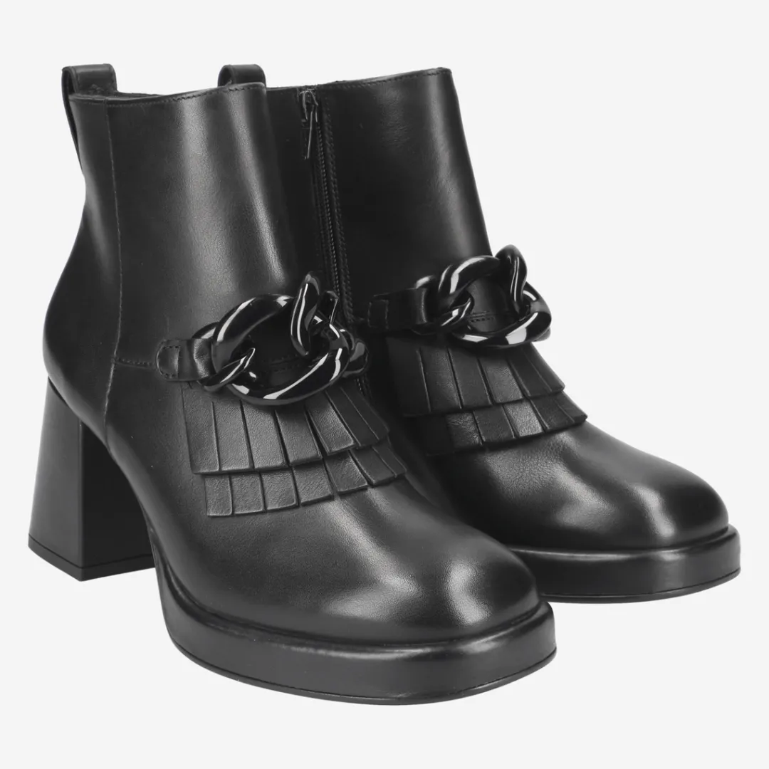 Stylish and noble present these ankle boots from Paul Green. The purist design of black smooth leather emphasizes a tonal jewelry chain and noble fringe detail around the instep area. A trendy block heel with a light platform sole makes for an absolute fashion statement. Paul Green shoes have a DNA of elegance and sportiness. This DNA is in every single shoe and in the entire range.