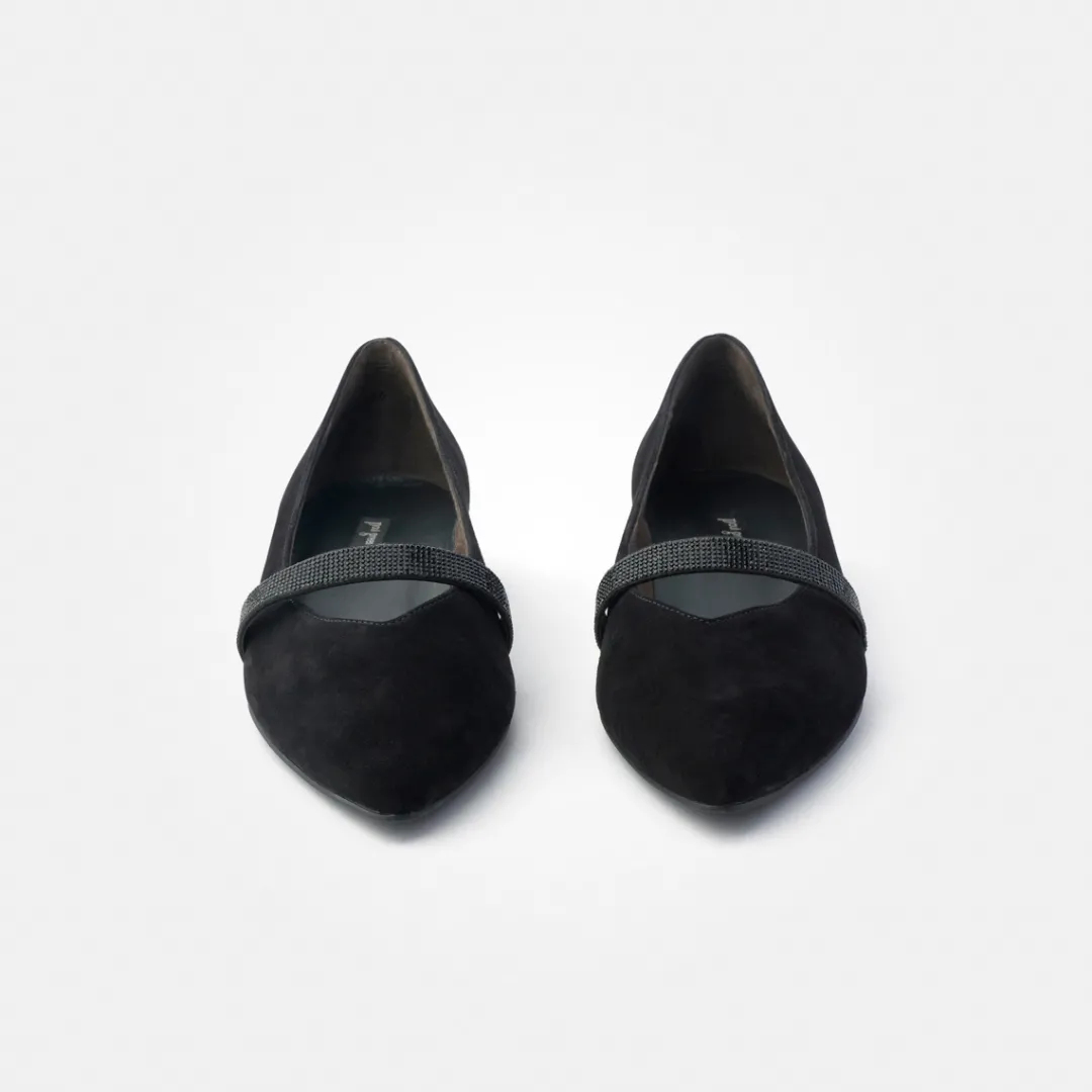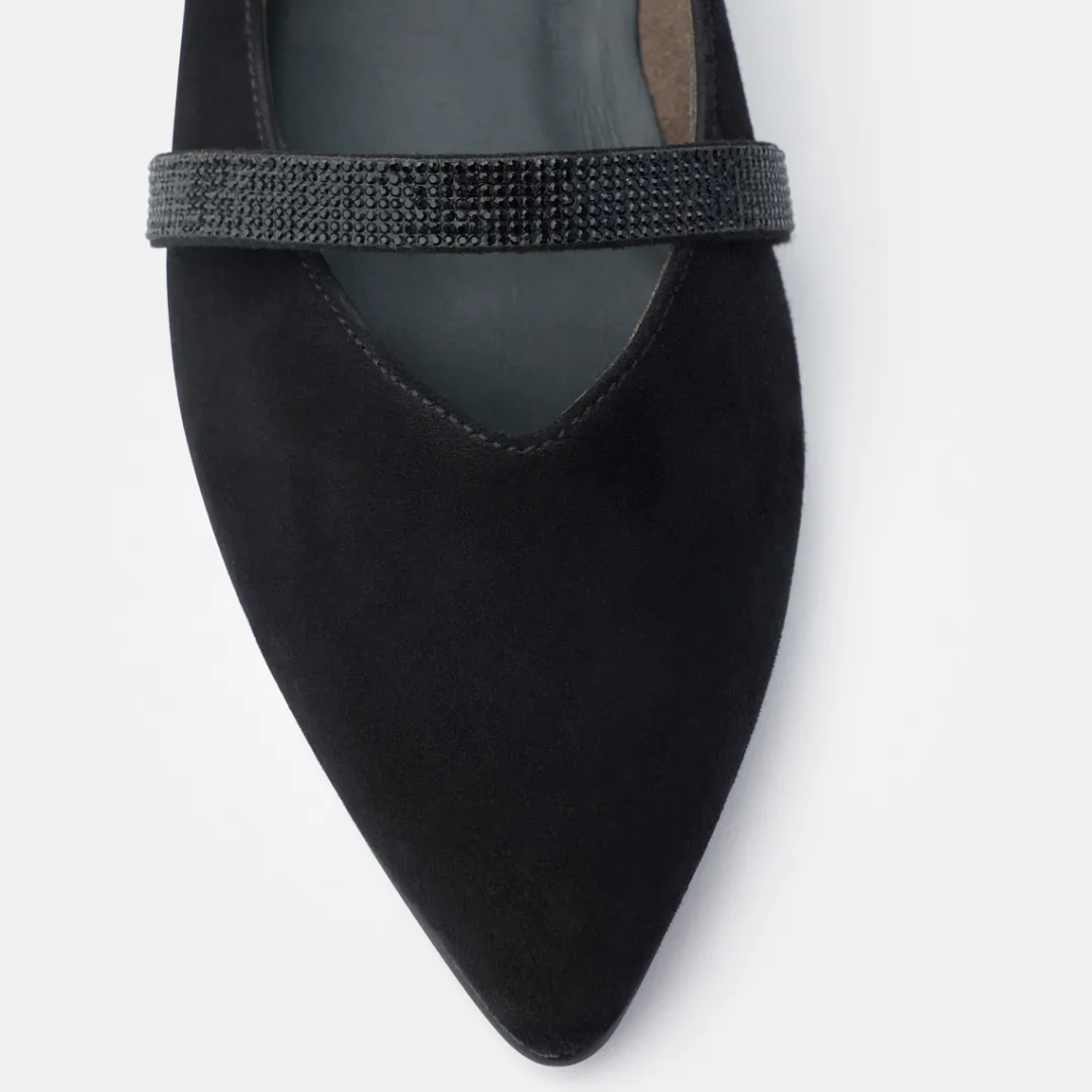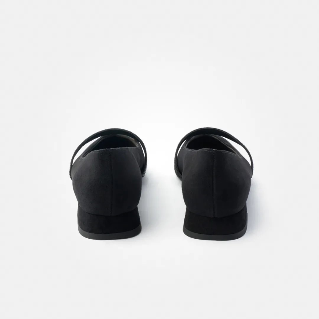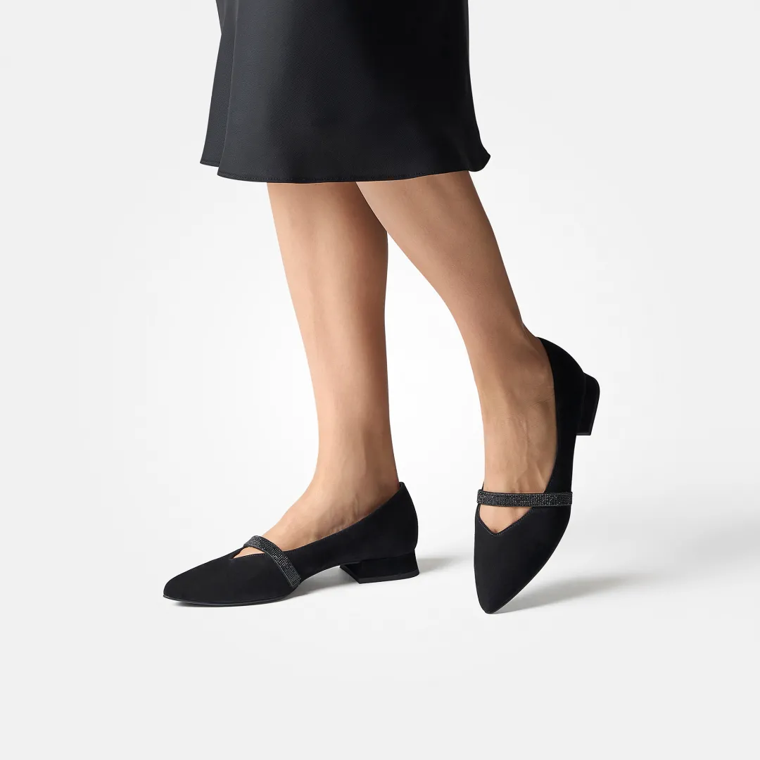 - Stretch insert on the strap, glitter look thanks to micro-glitter stones on the strap, almond-shaped toe