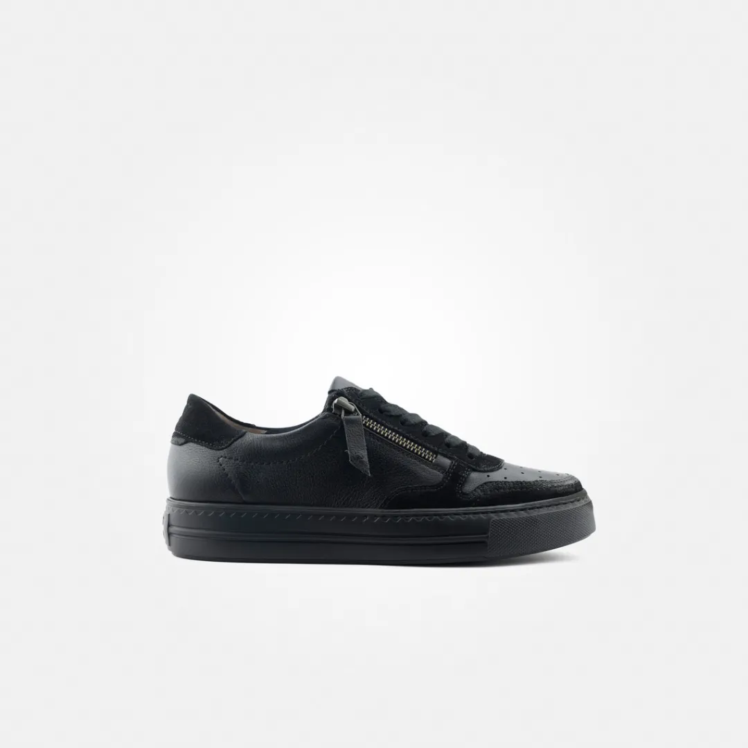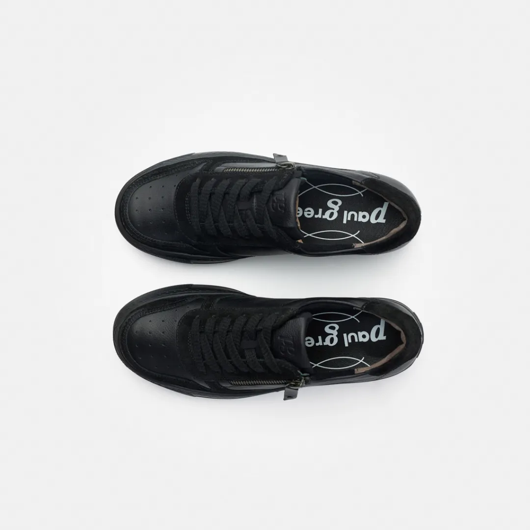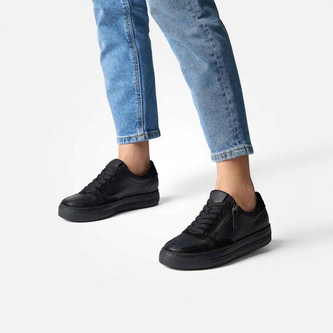 These SUPER SOFT trainers with RELAX-WEITE by Paul Green ensure a casual and comfortable leisure look. This pair impresses with a modern interpretation of smooth black leather with suede in a used style. A zipper on the side is another highlight and makes them easy to put on and take off. This model is particularly practical, as the comfortable insole can be removed and easily replaced with your own insoles. With the comfortable extra width F-G, these trainers also offer more volume in the toe and ball area. Enjoy casual design with functionality!