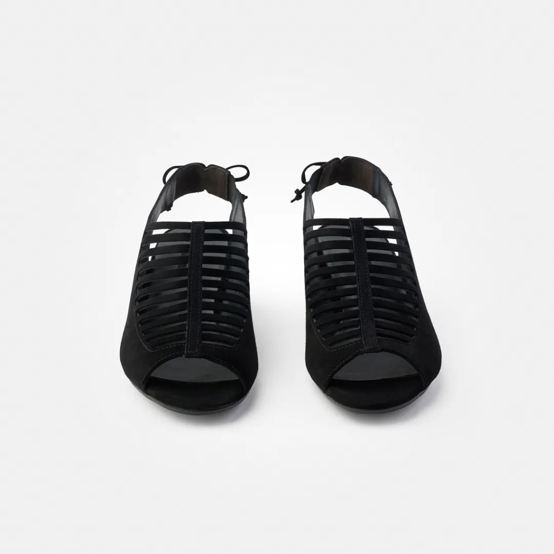 - slanted block heel, bow appliqué, cut-out, stretch insert, peep-toe sandal