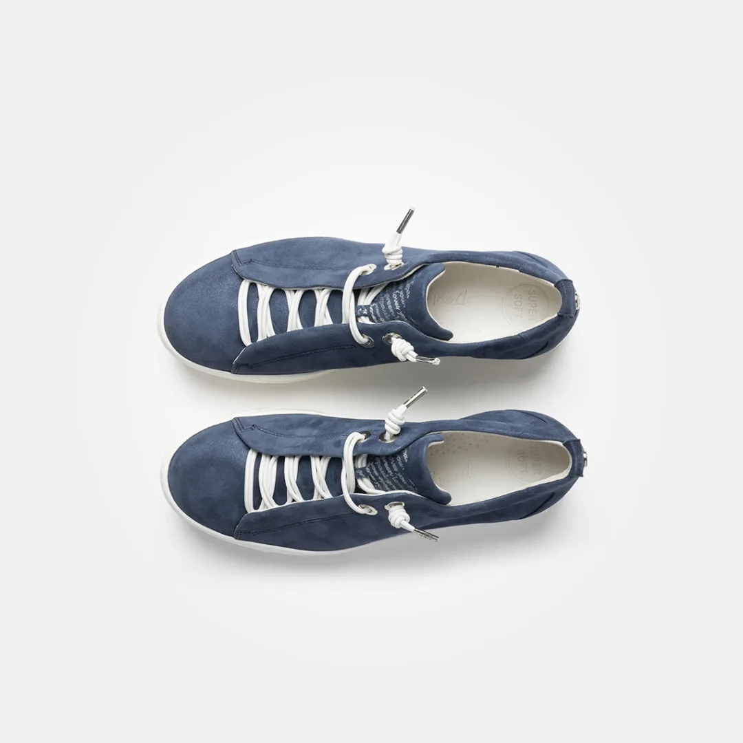 These SUPER SOFT Pauls from Paul Green are perfect for trendy everyday styles. The model impresses with blue metallic velvet leather and elegant details. The elasticated laces ensure a relaxed feel. Thanks to the super soft finish, this pair provides extra comfort. The wide outsole impresses with a trendy look. A perfect duo for leisure time or the office! Paul Green makes shoes with great passion, which is expressed in perfection, quality, style and fit. The result: a unique, uplifting feel!