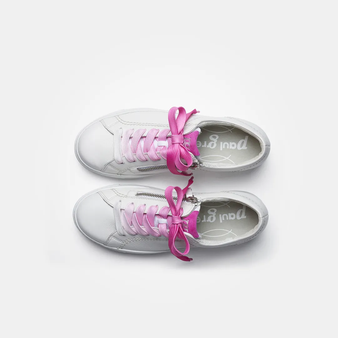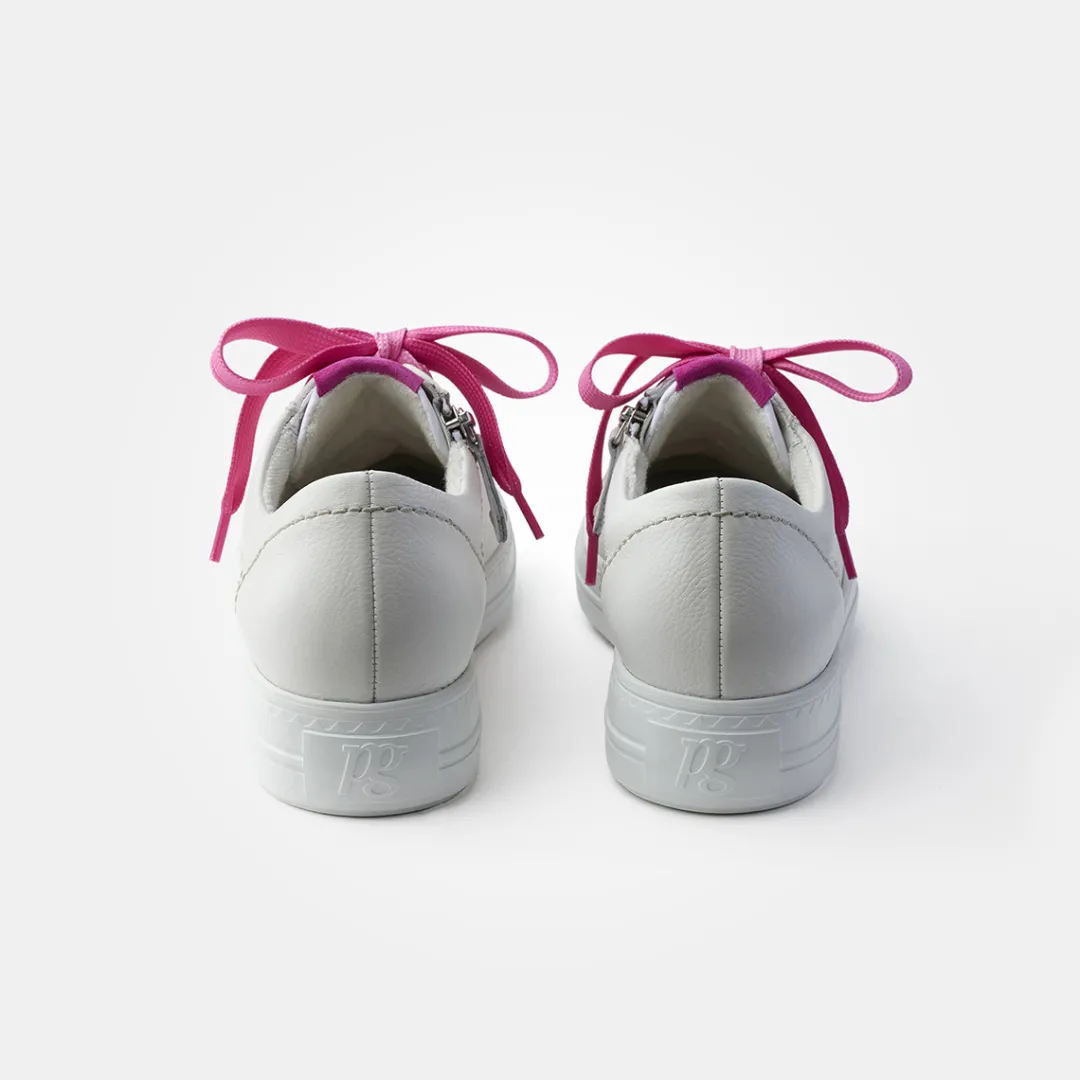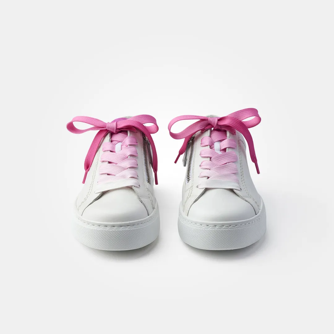 - White-to-pink color gradient on the laces, zipper, SuperSoft, supple leather, soft heel cap, light and flexible outsole, soft footbed, relax width, more width, special cut, orthopedically shaped removable footbed allows the skin to breathe, perforated leather insole in matching colors, air channels incorporated in the PU foam, recyclable with sustainable aspect, decorative stitching