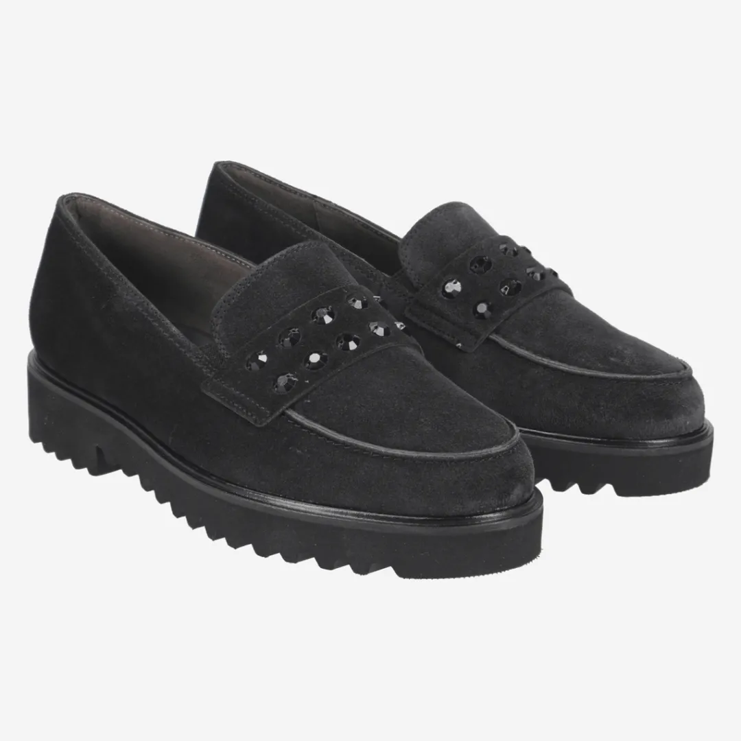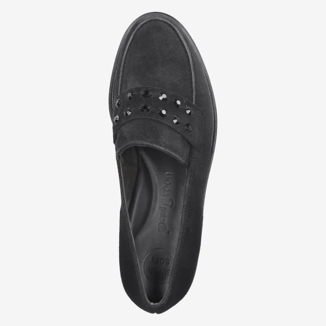 Add a fashionable twist to your outfits with these SUPER SOFT loafers from Paul Green. The fashionable style made of black suede with precious gemstone trim at the instep area makes them true all-round geniuses for the coming season. Thanks to the super soft finish and the durable outsole, this model ensures a wonderfully comfortable wearing experience. Don’t miss out on this distinctive model! Paul Green shoes have a DNA of elegance and sportiness. This DNA is in every single shoe and in the entire range.