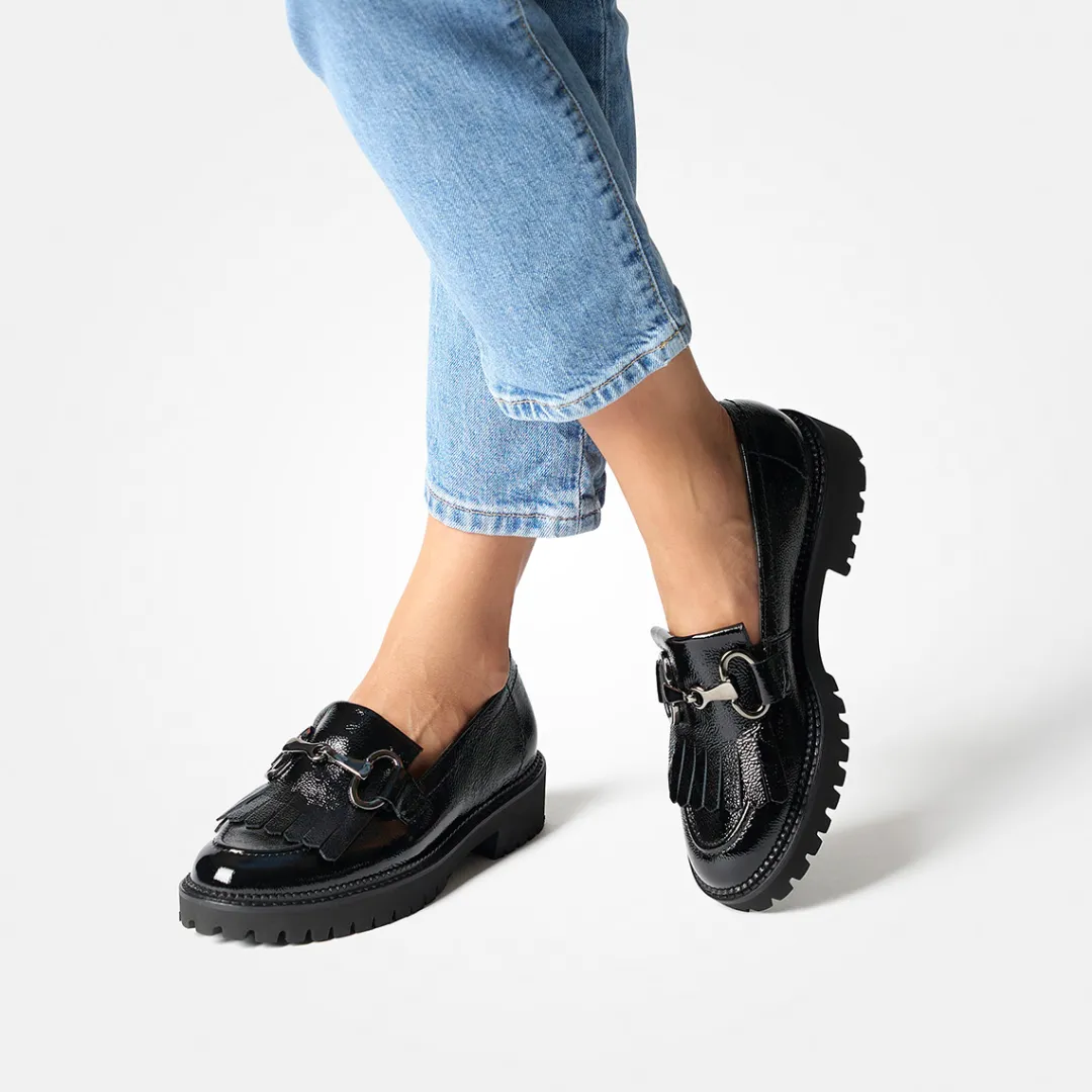 These SUPER SOFTEN loafers from Paul Green present themselves in an expressive design. The beautiful crumpled patent leather in black is contrasted by a noble chain and fringes and thus follows the trend of the season. Due to the super soft processing, the model is extremely comfortable to wear and uncomplicated in handling. The distinctive tread sole underlines the trendy look and ensures a secure appearance. This loafer is a real favorite! Paul Green makes shoes with great passion and mastery, which is expressed in perfection, quality, style and fit. The result: a unique, uplifting wearing experience! The Paul Green effect.