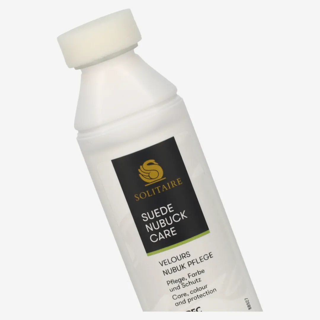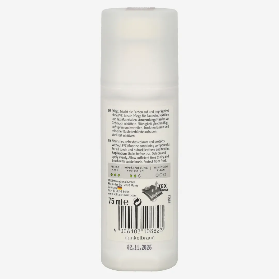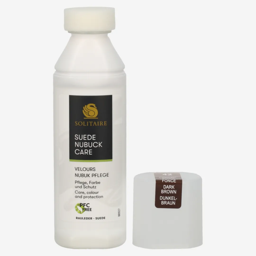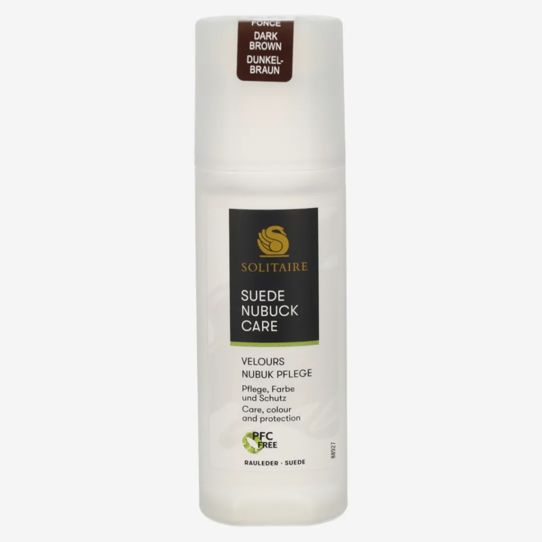Suede/nubuck care for dark brown suede leather from Solitaire. Impregnates and has a color-activating effect. Ideal care for suede and nubuck leather as well as textiles and Tex materials. Contents: 75 ml. Instructions for use: Shake bottle well before use. Dab the liquid onto the shoe. Allow to dry and then roughen with a suede brush.